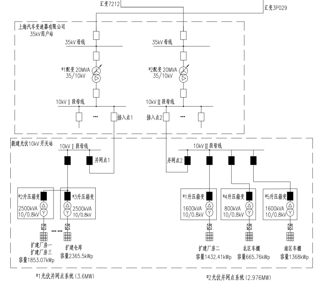 上海汽車變速器有限公司屋頂光伏發電項目(以下簡稱“本項目”),位于上海市嘉定區,裝機容量為8.3MW,采用自發自用余電上網模式。本項目現役35kV用戶站1座,站內2臺35kV主變,容量均為20MVA。本次光伏設計2個并網點,新建一座10kV開關站,光伏組件逆變為0.8kV交流電壓,經升壓后2個并網點以10kV電壓等級分別接入35kV用戶站的10kVⅠ段母線、Ⅱ段母線,并網點容量分別為3.6MW、2.976MW。